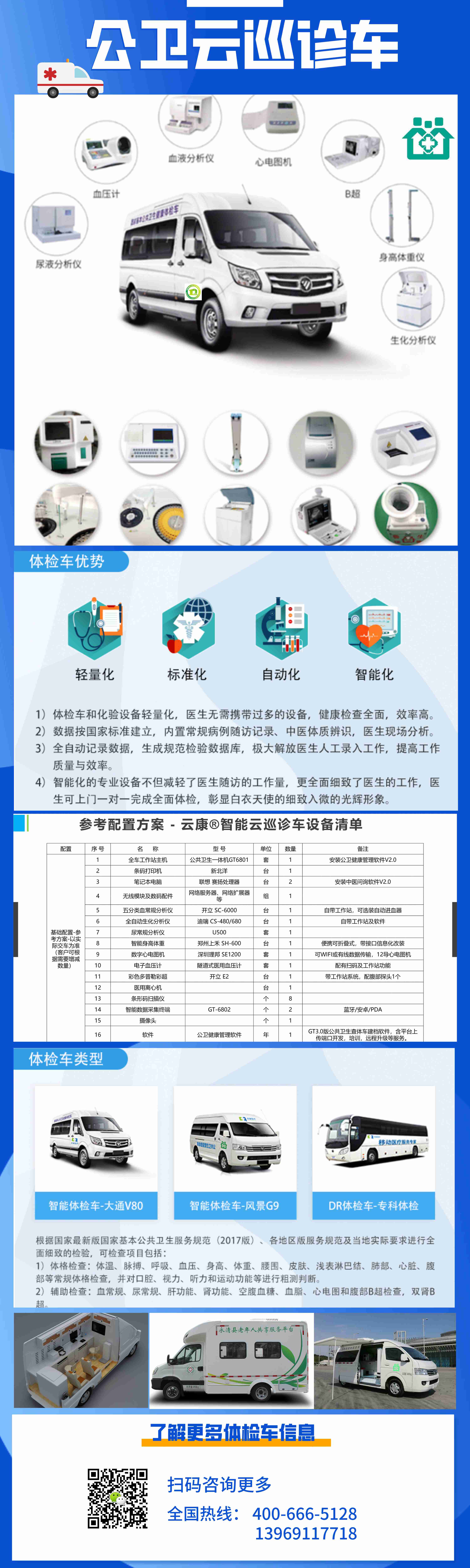 | 智能云巡診車 | 云康 | 1輛 | 藍(lán)牌C本醫(yī)療體檢車輛,全車專業(yè)改裝; | |